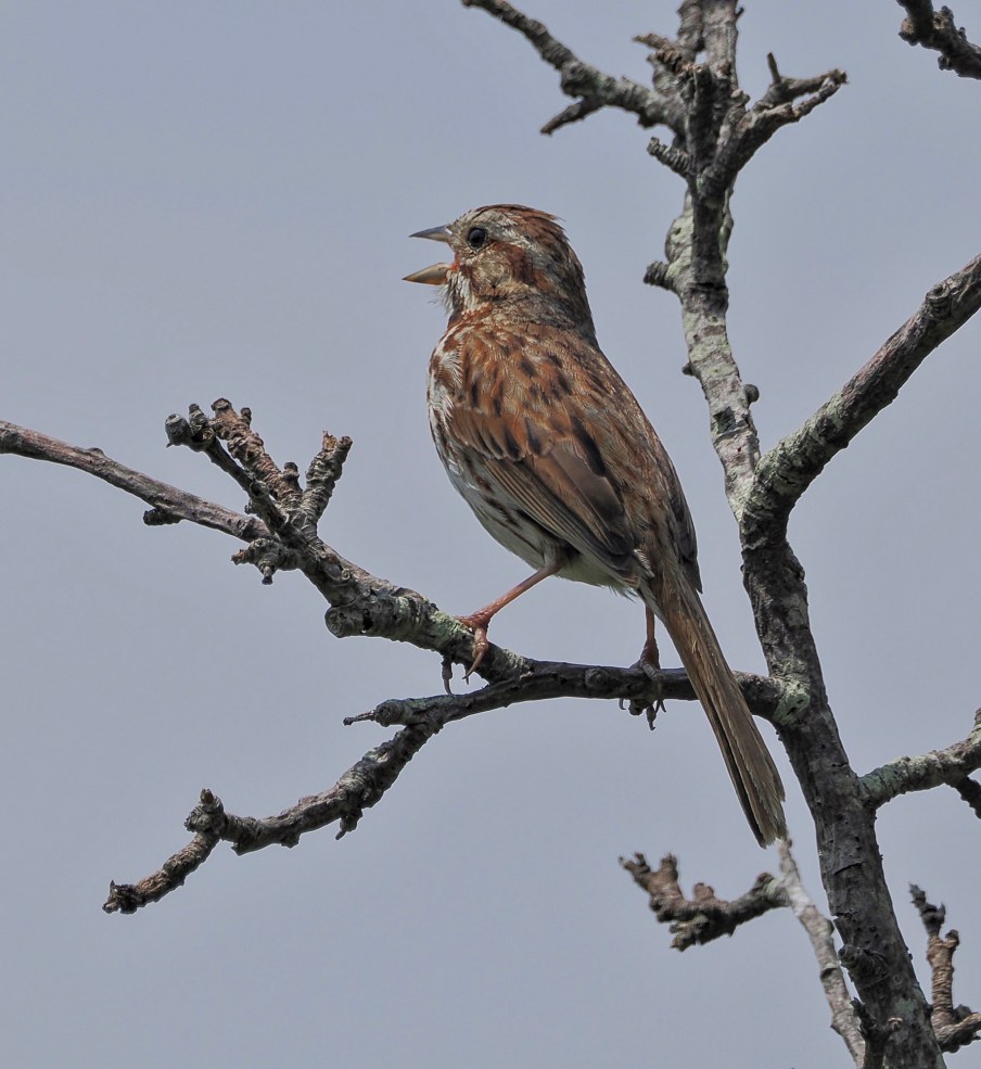 Song Sparrow: York County, Maine, USA, July 2023 — Song Sparrows seem to congregate behind the dunes of our local beaches, and well out into the marsh along the rivers. And, of course, they perch up to sing, so they are quite visible. OM Systems OM-1 with 100-400mm zoom at 800mm equivalent. Program mode with my custom bird modifications. Processed in Pixelmator Pro. ISO 200 @ f8 @ 1/1250th and @ f7.1 @ 1/1000th.
