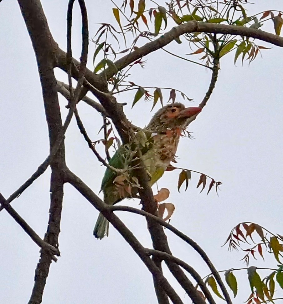 Brown-headed Barbet: Ashok Country Resort, New Delhi, India, March 2023 — Though we were to hear the monotonous single note call of the Brown-headed Barbet where ever we went in Rajasthan, the best view any of us had (if you can call this a good view), and certainly the only photo I was able to get (if you can call this a photo), was right on the grounds of our first hotel in Delhi…the Ashok Country Inn. Though it says “country inn” it was well within greater Delhi…an old “farm house” converted to a hotel as so many of them have been. It took me some time and some questioning of our local agent to figure out that “farm house” in India has a very different meaning than in the west. The English would call it a “country house” or “stately home”, and if we were in Maine, we would call it a “cottage”…an equally inappropriate name for the 14 bedroom summer estates where the women and children of the railroad and steel barons, and the great industrialist and merchants of the late 1800s retreated from the heat and bustle of the city for the summer, and their husbands visited by train or steamship on weekends. The Brown-headed Barbet on the other hand, is indeed brown headed. It calls endlessly, incessantly, all day, more frequently as the temperature rises, and its call carries form the high tree-tops over a great distance. This one had come down somewhat lower just at dusk a we were headed in for our first dinner as group and the light was failing, hence the poor image. Our guides must have pointed out its call a hundred times in the two weeks we were in Rajasthan, but we never saw another one. Sony Rx10iv at 600mm equivalent. Program mode with my custom birds and wildlife modifications. Processed in Pixelmator Pro and Apple Photos. ISO 2500 @ f4 @ 1/500th. Plus 2EV.