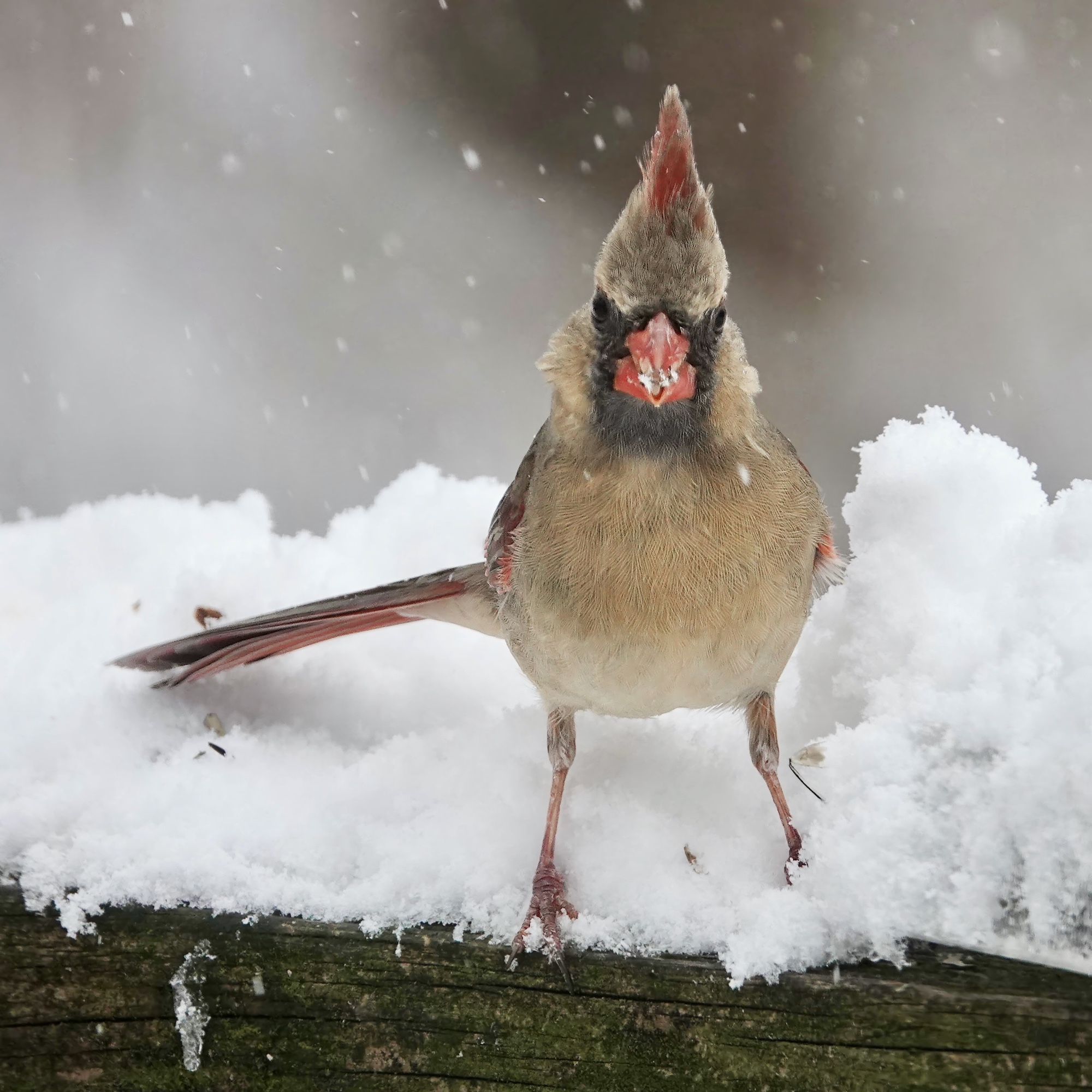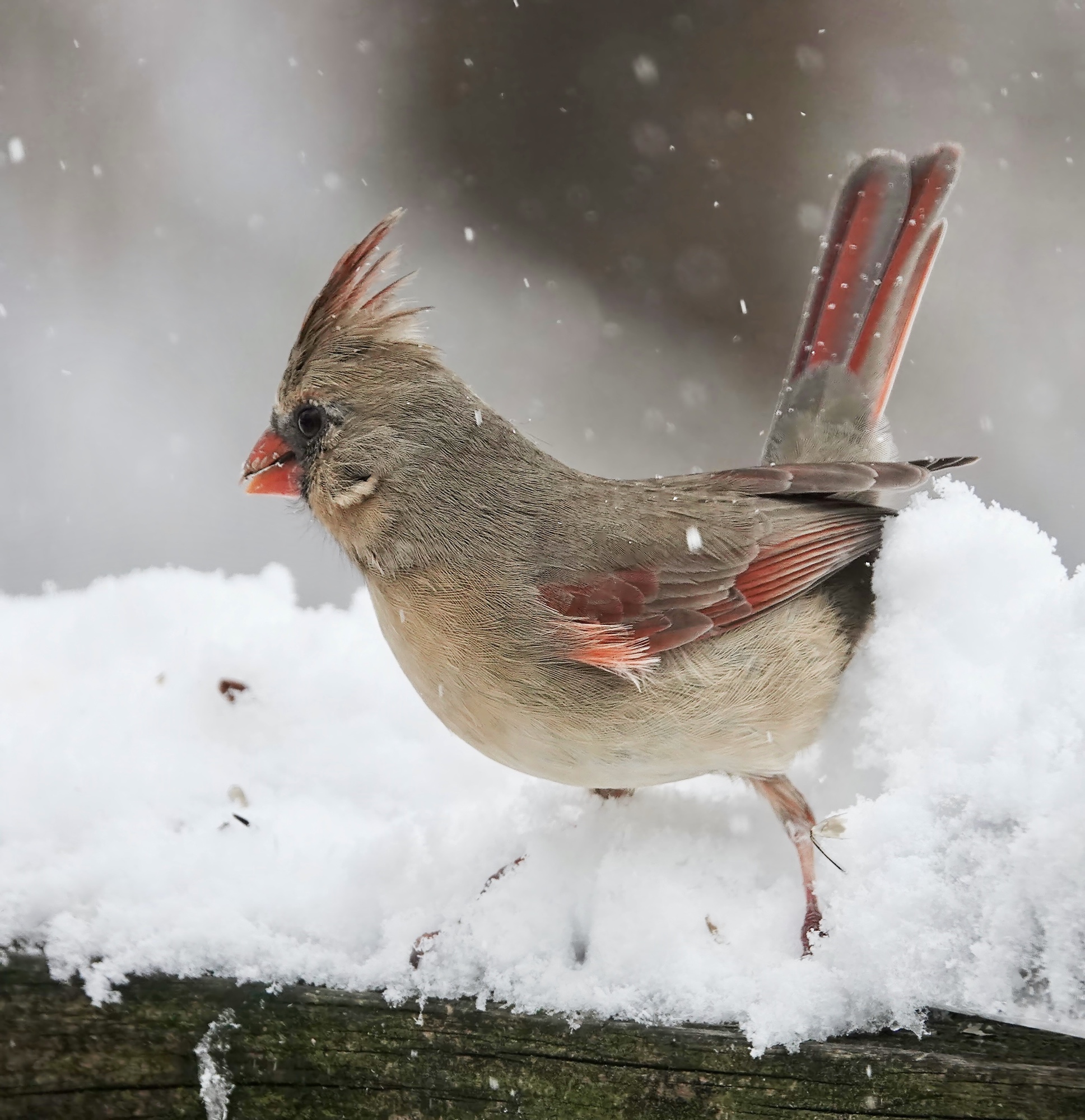 Northern Cardinal: Kennebunk, Maine, USA, February 2023 — The birds were not only active at the feeders during the end of February snow-storm, they were active around the feeders…particularly active, bouncing around, fluttering, being generally aggressive toward each other for no apparent reason…active! This female Northern Cardinal posed for a second, and then danced in place for several. Sony Rx10iv at 600mm equivalent. Program mode with my custom birds and wildlife modifications. Process in Pixelmator Pro and Apple Photos. ISO 400 @ f4 @ 1/500th.