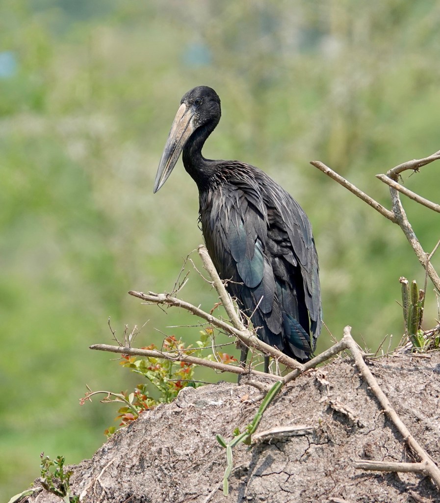 African Openbill Stork: Lake Mburo National Park, Uganda, August 2022 — This bird is generally just called the African Openbill, or even Openbill, but it is obviously a Stork and some references add the Stork to the name. We can on this one in a wet field still on our way to our lodge at Lake Mburo, posing nicely on its termite nest. Sony Rx10iv at 600mm equivalent. Program mode with my custom birds and wildlife modifications. Processed in Pixelmator Photo and Apple Photos. ISO 100 @ f4 @ 1/500th.