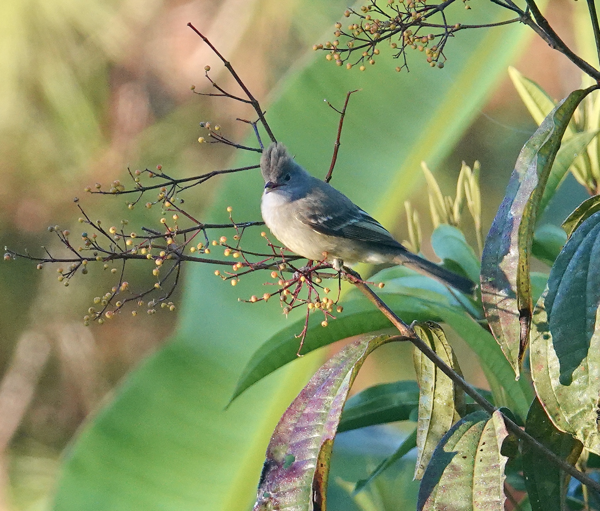 Yellow-bellied Elaenia: Las Cruces Biological Research Station, San Vito, Costa Rica, December 2022 — The Elaenias are pretty plain by tropical bird standards, but the Yellow-bellied has this interesting double crest that is often erected, making it stand out…as it does here in the early morning light at Weldon Botanical Gardens. I was out looking for the Snowy-bellied Hummingbird, which I did eventually see, but the Elaenia keep me entertained while I was waiting. The Yellow-bellied Elaenia has a wide distribution from southern Mexico all down through Central America, at all but the highest elevations. Sony Rx10iv at 600mm equivalent. Program mode with my custom birds and wildlife modifications. Processed in Pixelmator Photo and Apple Photos. ISO 800 @ f4 @ 1/500th.