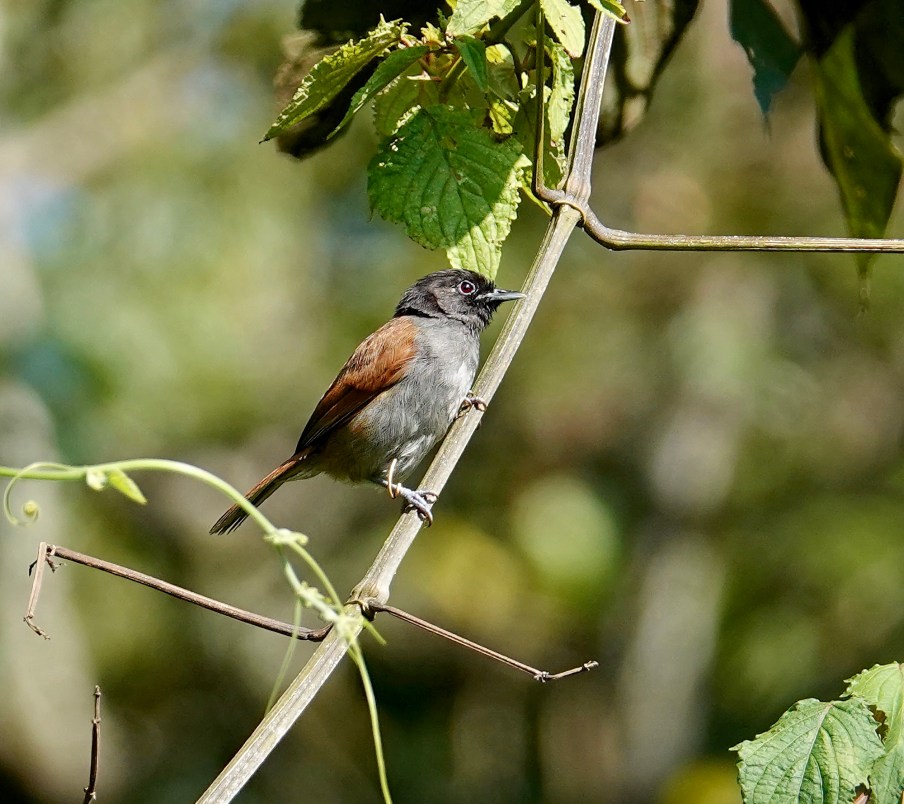 Dusky Crimsonwing: Bwindi National Park, Uganda, August 2022 — I got better photos (or at least photos in better light) of this bird at Mghinga National Park a few days later, but our guide Gordon worked so hard for these first photos that I have to post them. 🙂 This is another Albertine Rift endemic, with a very limited range on the western slopes of the volcanos of East Africa. This Crimsonwing is a skulker par excellence, and we got glimpses of it all around the parking area at the Gorilla Trek trailhead in Bwindi, but it was too quick for me to get a photo. Gordon did not give up though, and we eventually caught this bird in the open long enough for a burst. Sony Rx10iv at 595mm equivalent. Program mode with my custom birds and wildlife modifications. Processed in Pixelmator Pro and Apple Photos. ISO 1000 and 1250 @ 4 @ 1/500th.