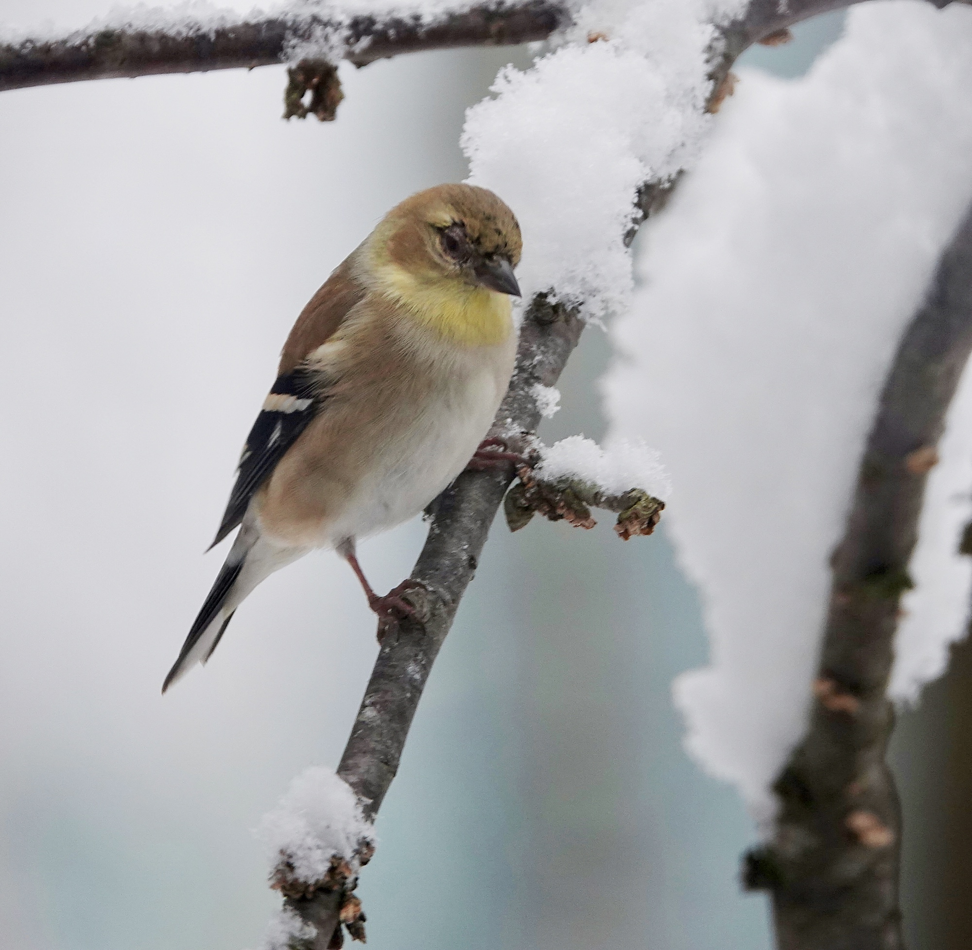 House Finch and American Goldfinch: Kennebunk, Maine, USA, January 2023 — We woke up to one of those winter wonderland scenes with wet snow clinging to every branch and bush and about 3 inches on the ground. It did not last more than a half hour once the sun and the wind got up, but it was traditionally beautiful for a few moments there. I managed a few shots in the early light to catch the contrast between the birds and the snow. House Finches have been coming to the feeders for the past two weeks. They are occasional visitors year round, but way outnumbered by the Purple Finches in the spring. American Goldfinches are another year round visitor. We are currently hosting a flock of at least a dozen. And this scene, with the fresh snow, is just a memory. Sony Rx10iv at 600mm equivalent. Program mode with my custom birds and wildlife modifications. Processed in Pixelmator Pro and Apple Photos. ISO 320 @ f4 @ 1/500th.