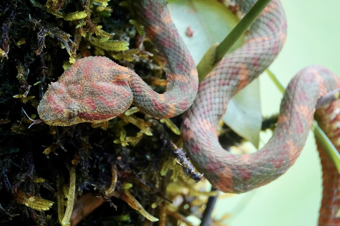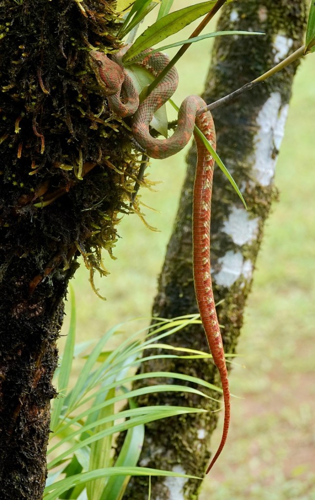 Eyelash Pit Viper: Las Tardes Community Ecology Project, Corcovado National Park, Osa Penninsula, Costa Rica — As I mentioned in a previous post, because of high water and damaged roads up the river channel we could not take our normal tractor and trailer ride up the Recon River into Corcovado National Park, so we drove into the Las Tardes Community Ecology Project at the edge of the park. One of their projects is snake relocation. They pay local farmers to bring the snakes they encounter in their fields to them, rather than just killing them, and then, after keeping them a few days to make sure they are healthy, they relocate them deep in the park. On any given day they may have several venomous snakes ready for relocation. They brought out two Eyelash Pit Vipers for us to see and photograph: one the bright yellow we associate with the species, and this one which is quite different in color. It turns out that Eyelash Pit Vipers come in a variety of colors…and there can be any number of colors in a single hatch of eggs. Sony Rx10iv at 600 and 192mm equivalents. Program mode with my custom birds and wildlife modifications. Processed in Pixelmator Photo and Apple Photos. ISO 1600 and 400 @ f4 @ 1/500th and 1/400th.