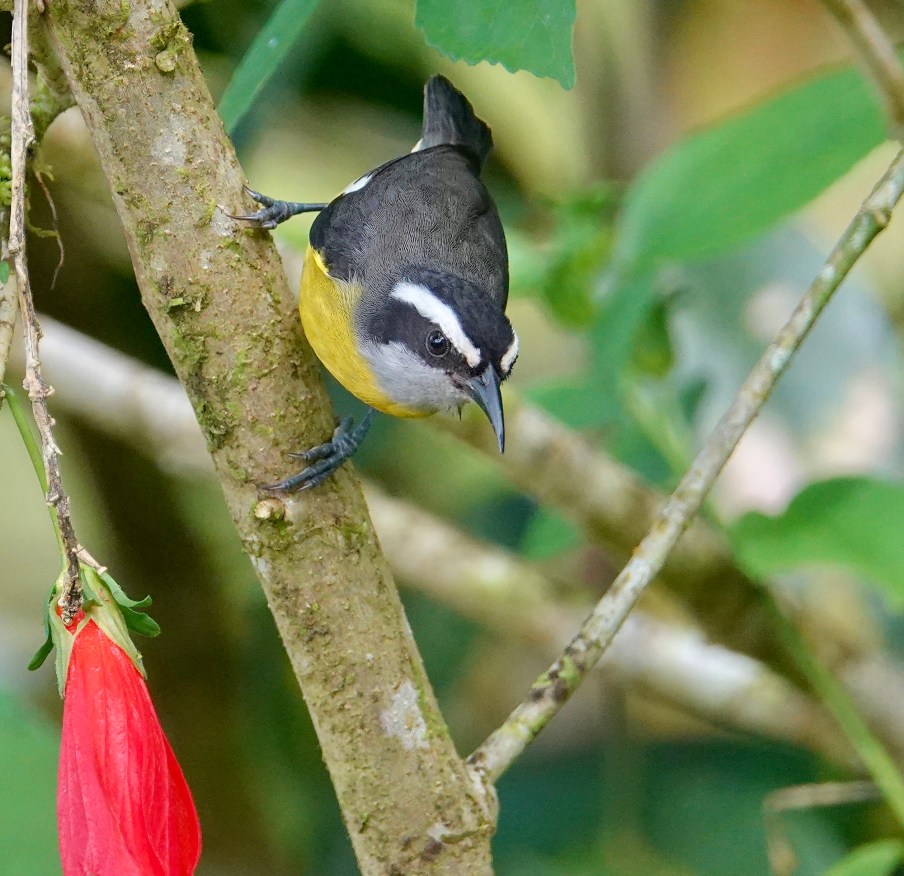 Bananaquit: Las Tardes Community Ecology Project, Corcovado National Park, Osa Peninsula, Costa Rica, December 2022 — The Bananaquit has long complicated story. It was placed with the new world warblers, or the sparrows (buntings), or maybe in a genus of its own…before genetic profiling put it with the tanagers, in the same sub-family as Darwin’s Finches. It is a wide-spread bird all through Central and South America and the Caribbean, occasionally reaching extreme South-Florida in the US. It has an unusual amount of variation over its range, with island birds in particular, being quite different looking than those found on the continents. It has 41 (41!) recognized sub-species, at least a few of which are already on track to be split into species of their own. So, no, not a simple bird, though common all through the American tropics. It eats nectar and fruit and can be seen around dwelling with gardens. It will come to bananas at feeders. Sony Rx10iv at 600mm equivalent. Program mode with my custom birds and wildlife modifications. Processed in Pixelmator Photo and Apple Photos. ISO 800 @ f4 @ 1/500th.