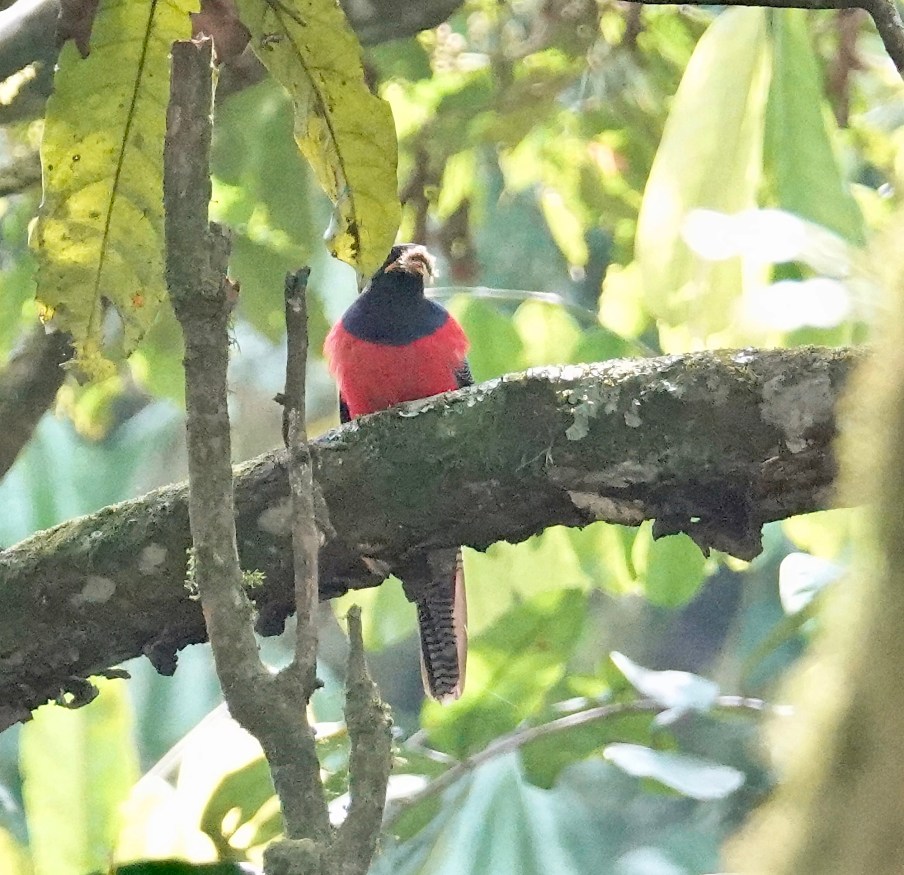 Bar-tailed Trogon: Neck, Bwindi Impenetrable Forest National Park, Uganda, August 2022 — Another good bird, though only a “for the record” shot, from our spot in forest of Neck along the road from Ishasha to Bwindi. The Bar-tailed Trogon is one of two trogons in East Africa and is only found in a narrow band just where we were in Uganda. This bird was distant, in the dark, and obscured by foliage, so I am, overall, happy with the record. 🙂 Sony Rx10iv at 600mm equivalent. Program mode with my custom birds and wildlife modifications. Processed in Pixelmator Pro on the Mac Air. ISO 2500 @ f4 @ 1/500. Plus 1.7EV.