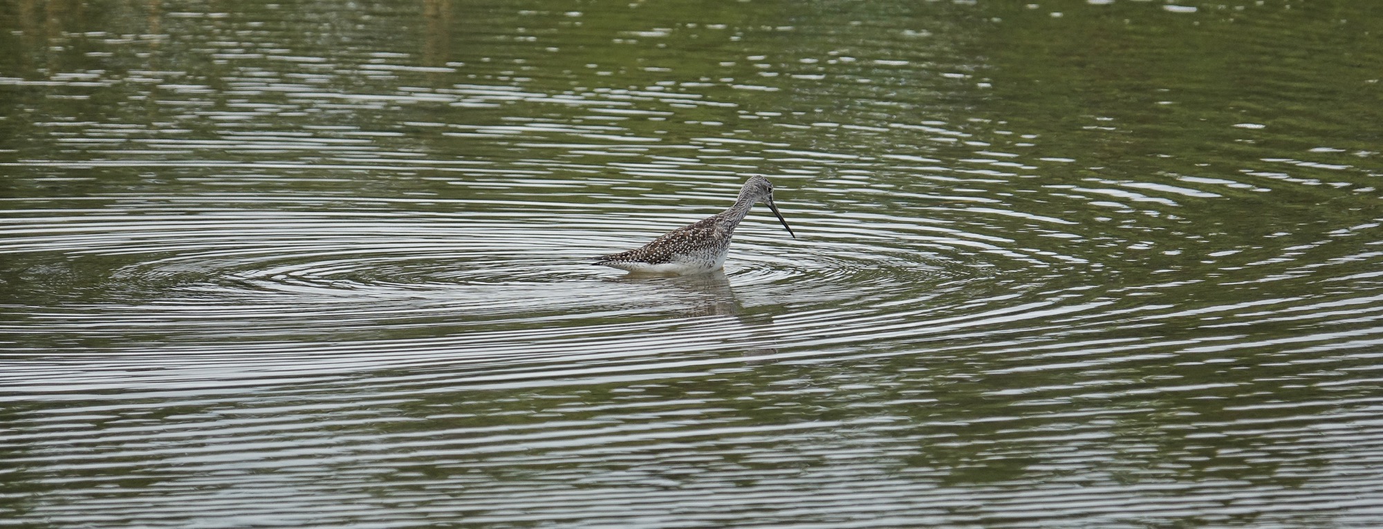 I am pretty sure this is a Greater Yellowlegs. I was completely sure when viewing the bird in the field, but now that I come to post the pic, and have to put the name in writing, I am wondering how I knew it was not a Willet? Okay, it is time for Greater Yellowlegs to pass through, and Willets are more common in early summer…and there is something about the body posture and proportions that says Yellowlegs to me…but I could easily be wrong. There is not a lot of difference in plumage, especially this time of year when breeding plumage is beginning to fade. Of course, if I could have seen the legs š Still, I am going with Greater Yellowlegs until someone who knows better than I corrects me. Mostly I like the ripples in the water as the bird stalked forward. There is even an interesting optical illusion happening were the bill of the bird crosses the ripple pattern. Can you see it?