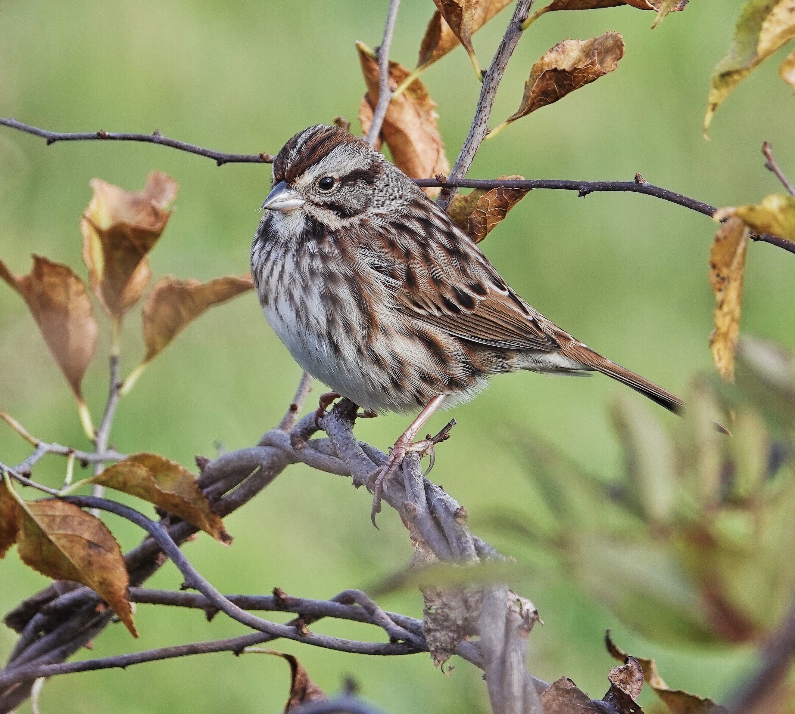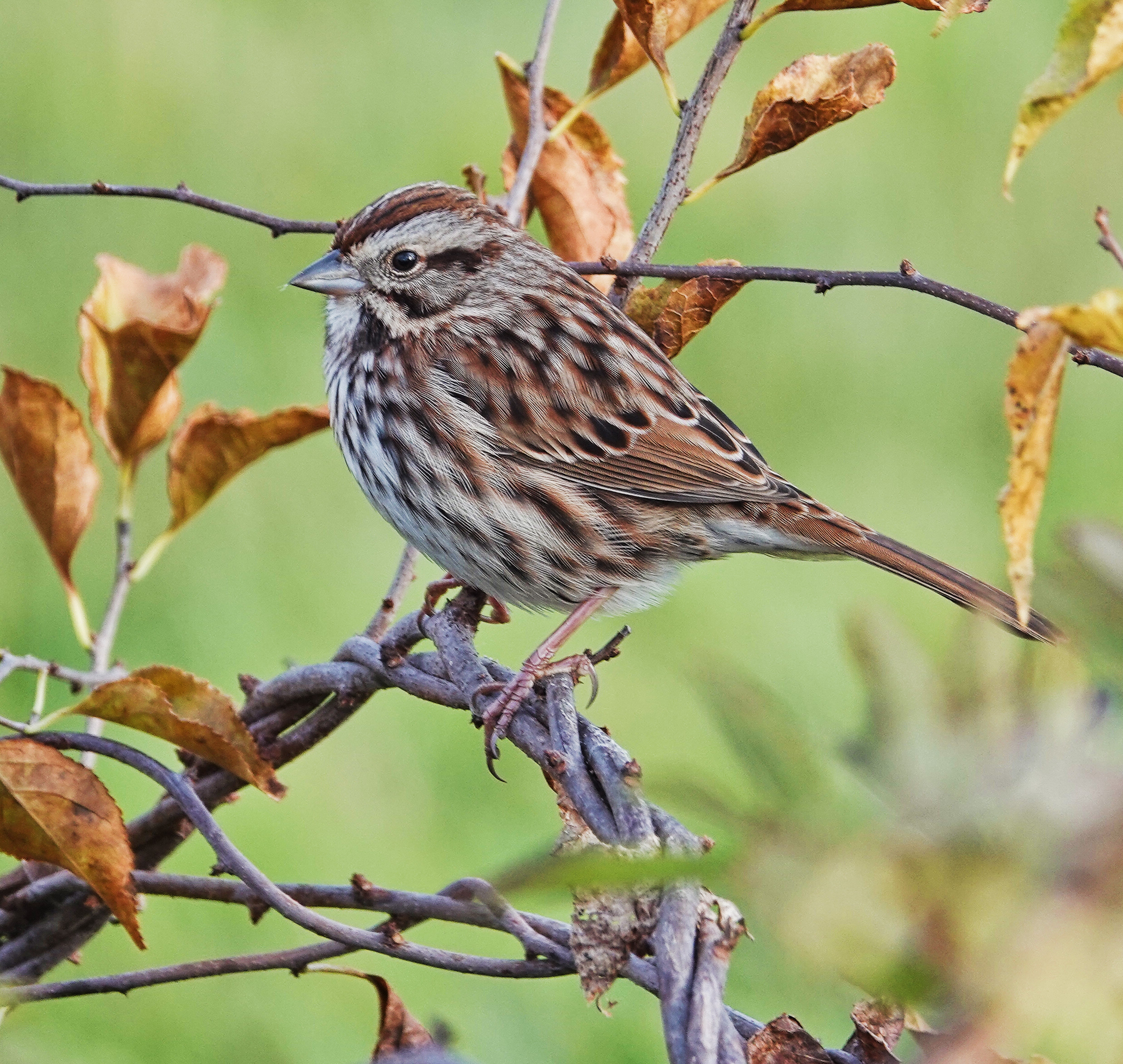 So, I am thinking this bird is a Song Sparrow. I am slightly embarrassed to admit that I can not be sure. For one thing, there was a flock of them, feeding together in short grass between the drive and the edge of the woods and/or hedge at Laudholm Farms in Wells Maine. They would fly up and into cover when I approached. I have seen Song Sparrows behave that way, but only during migration, and only at Cape May, New Jersey. Still, it is the right time of year. For another thing, most of the birds lacked any noticeable central breast spot…but then, Song Sparrows are notoriously variable. Finally, they seemed too small, and not “plump” enough, but then I generally see Song Sparrows posted up (and probably puffed up) singing. The alternatives are not good either. I have other shots from further away, and in no shot can I see even a hint of buff where it ought to be on a Lincoln’s and I have never seen a Lincolns out in the open feeding as these were. Savannah? I should see at least a hint of yellow above the eye on some bird, don’t you think? And way too brown for Vesper, and lacking the bold eye-ring. So, Song Sparrow. I think. Unless am just missing something obvious altogether. I am probably overthinking it, but I have seen what happens when people post pics with the wrong ID. (Not pretty!) This is one of those cases where it really would have been better to make the ID in the field, and not rely on the pics when I got home. (You can, by the way, take a look at each photo at higher resolution.) On the other hand, I really like the photos. The bit of fall foliage and the poses, etc. Great Sparrow shots…just not totally sure which Sparrow. And really, I ought to know better (or at least be more confident). Sony RX10iv at 600mm equivalent. Program mode. Processed in Polarr.