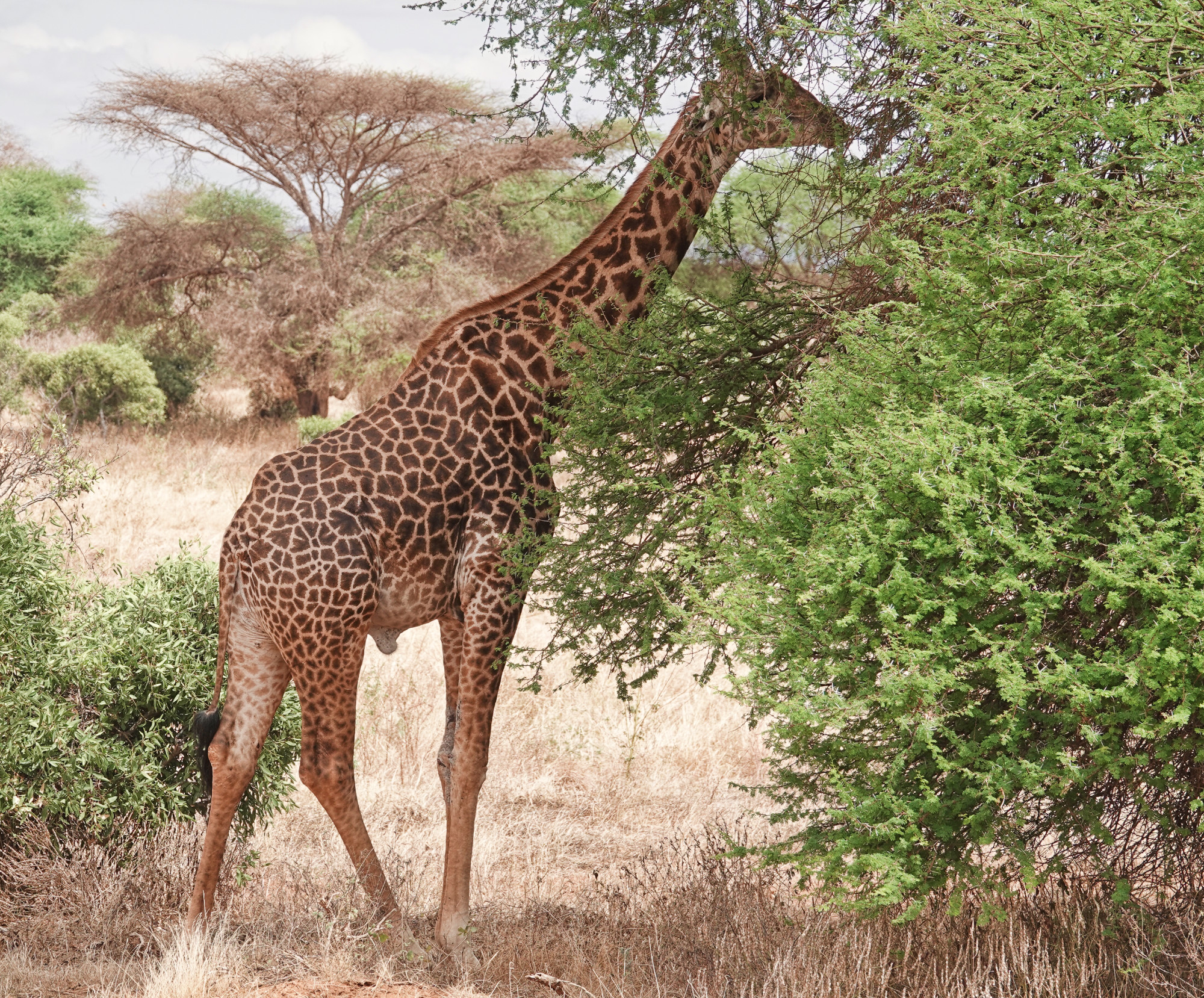 For the first several days of our safari, through Tsavo East and West, and Amboseli, the one animal we did not have close encounters with was the Giraffe. This is as close as we got: a Masai Giraffe (the most common in East Africa), at Tsavo East. (Some spell it “Maasai Giraffe” though I have not seen Masai spelled that way except in the name of this Giraffe.) You can tell it is a Masai by the irregular shapes of the patches. It is a male, and even if you could not see the obvious, the horns have no feathering. We did get closer (much closer) to Masai Giraffes on Crescent Island on Lake Naivasha, but, though living wild now, they were introduced there for the filming of “Out of Africa.” And we saw Rothschild’s Giraffes, also introduced, at Lake Nakuru, where the rarest of the African Giraffes maintains a healthy herd. Most authorities still consider the three varieties of Giraffes in Africa as sub-species or even “varieties” of the same species, through some have proposed full species status for each of them. They do freely hybridize where their ranges overlap. As to the interesting question of why the Giraffe has such a long neck…most, including Darwin, theorized that it developed due to a competitive advantage in reaching the highest foliage. That makes sense. However more recent thinking is that the longer necks and heavier heads of the biggest males provide a much more direct advantage to males who have them…in that “necking” (see a previous post of two Giraffes at Hell’s Gate doing that) is their only form of combat…and more successful males get more opportunities to mate. Of course, it could just be that the creator needed a big tall browser to keep the acacia trimmed to those classic African umbrella shapes across the African savannas…as this fellow is busy doing. Sony RX10iv at 200 and 600mm equivalents. Program mode. Processed in Polarr.